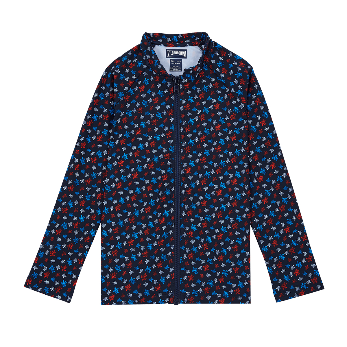 Uzun kollu ve kolay giyilip çıkarılabilen fermuarlı ön kısmıyla maksimum UV koruması sağlayan çocuk tişörtü.