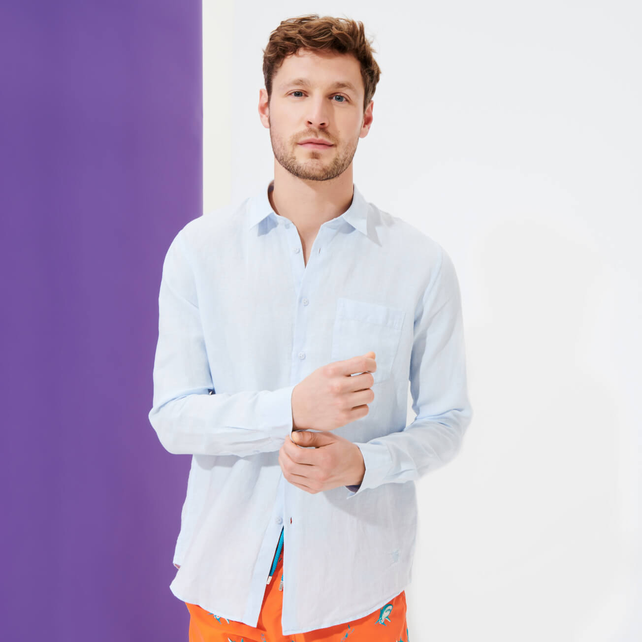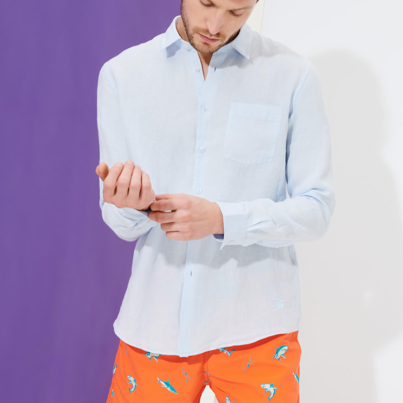 Caroubis uzun kollu keten gömlekler, Vilebrequin’in St Tropez’den ilham alan stilini klasik, sade bir kesimle gösteriyor. Yumuşak keten kumaştan yapılmış bu gömlek, eteğinde aynı tonda işlenmiş ikonik kaplumbağa logosu ile dikkat çekiyor.