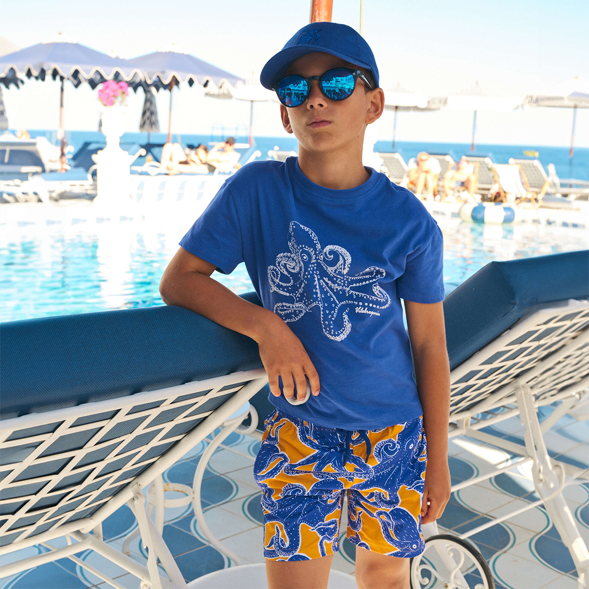 Plajda geçireceğiniz rahat günler için, rahat organik pamuklu jarseden üretilen bu çocuk tişörtünün ön kısmında göz alıcı bir baskı bulunuyor. Bu ürün koleksiyondaki şortlar ile mükemmel şekilde kombinlenebilir.