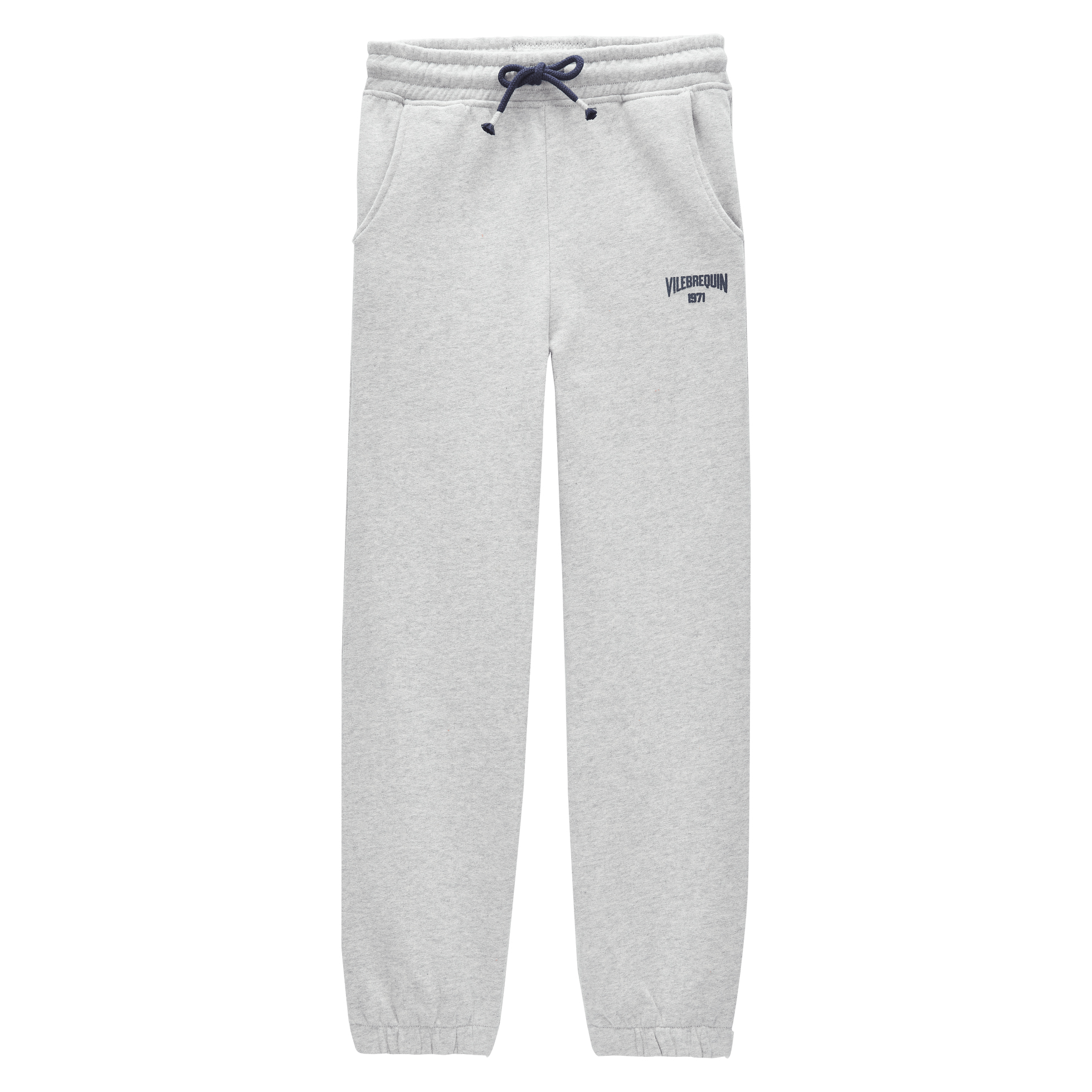 Vintage spor giyim: Retro Amerikan üniversite görünümünden ilham alan sade ve ikonik Vilebrequin logosuyla süslenmiş çocuk eşofman altı