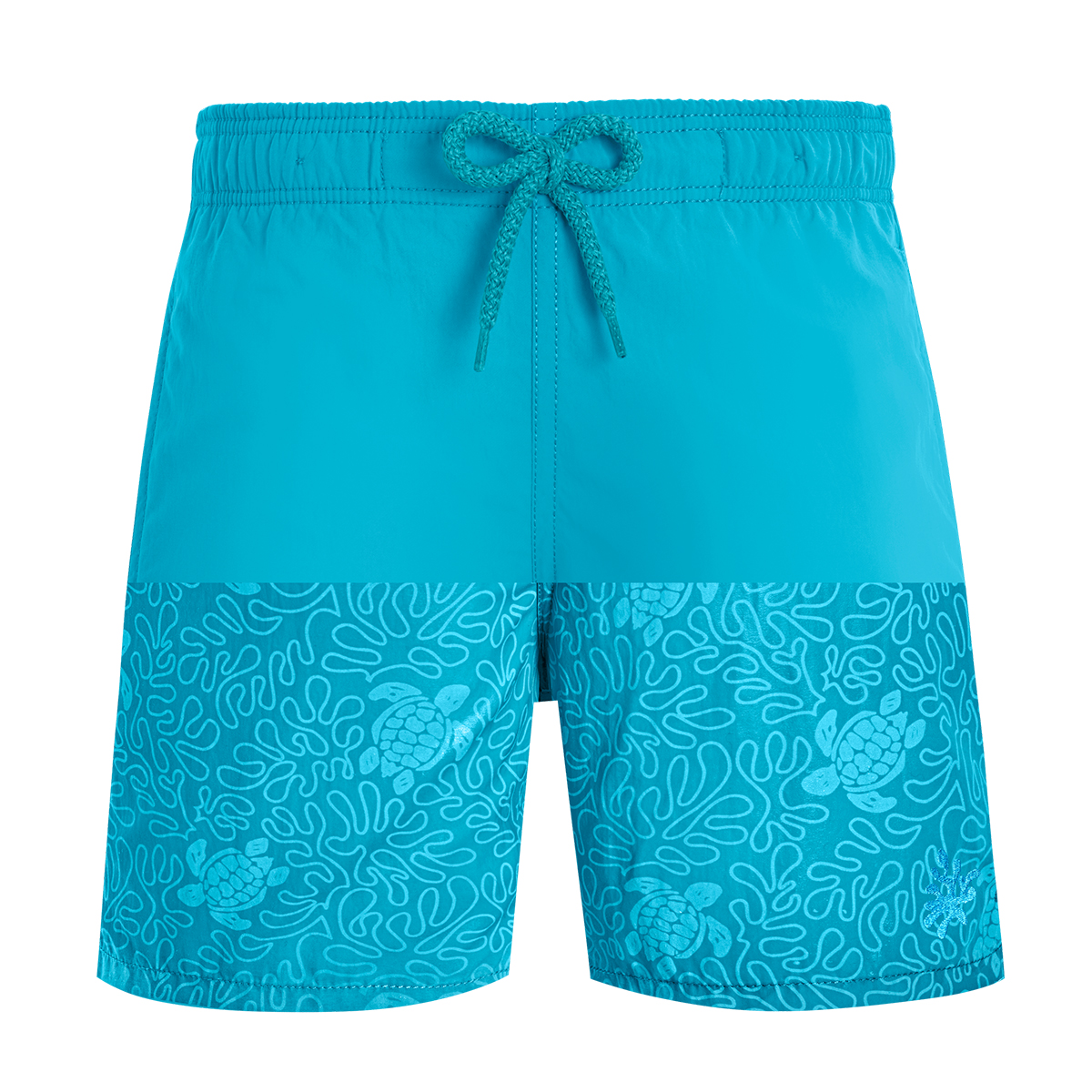 Bu Water-Reactive erkek çocuk mayolarının üzerindeki su desenleri saklambaç oynuyor çünkü ıslandığında ortaya çıkıyorlar ve kuruduğunda kayboluyorlar. Kuruduğunda düz renk olan bu mayolar, kumaş suyla temas eder etmez neşeli desenlerle kaplanır. Elastik kemer