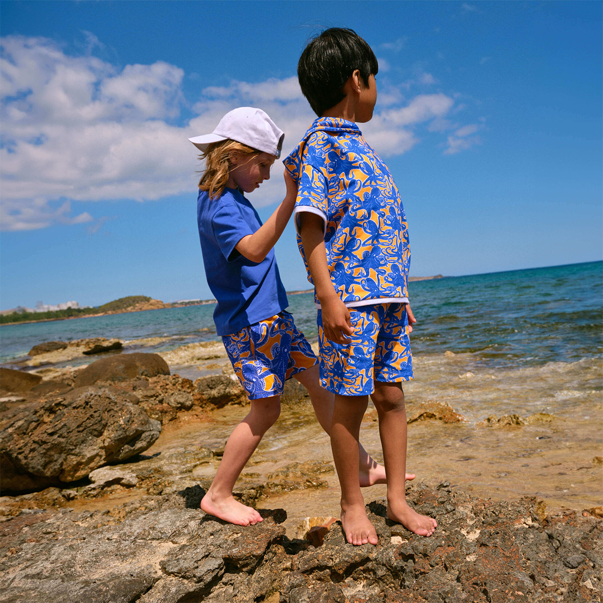 Yumuşak ve hafif Jirise erkek çocuk yüzme şortu, streç kalıbıyla Vilebrequin tasarımına yeni bir yorum getiriyor. Erkek Moorise modelinin çocuklar için uyarlanmış bu versiyonu iki yan ceplerine ek olarak sabit bir düğüme, elastik bel bandına ve arka cebe sahiptir.