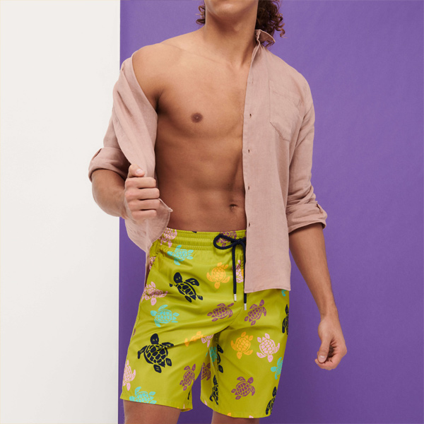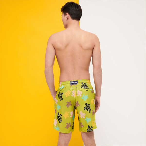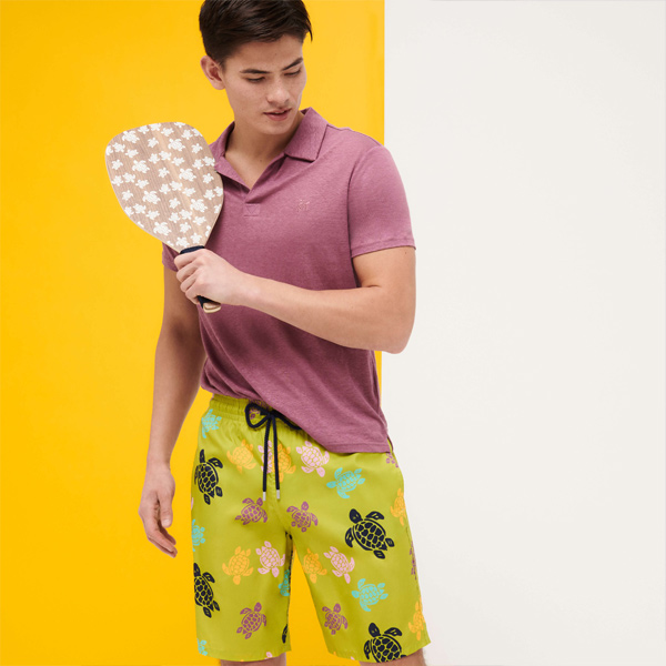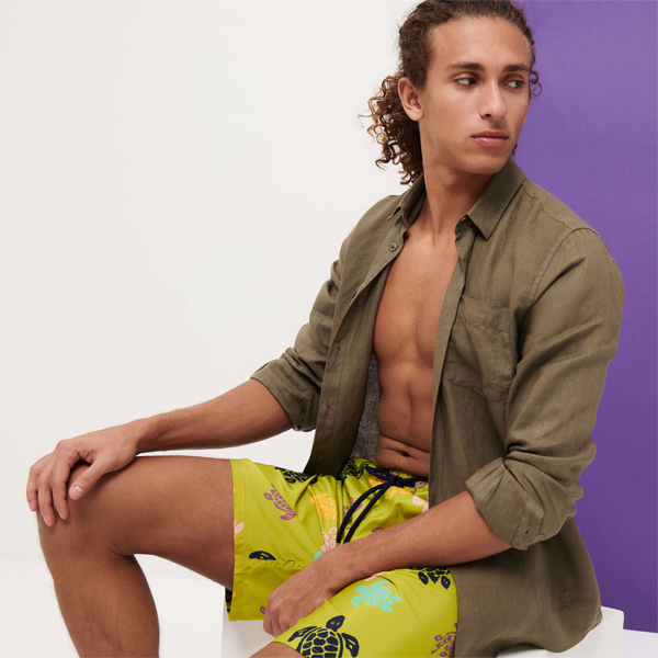 Hafif kumaşı ile dikkat çeken Mahina’nın uzun versiyonu olan Okohina erkek mayo, katlanarak arka cebine sığıyor ve üzerinde kauçuk Vilebrequin logosu yer alan bir keseye dönüşebiliyor.
