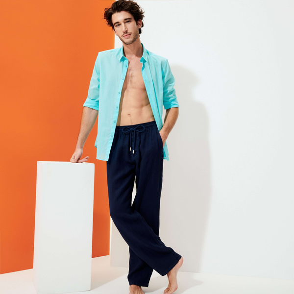 Esnek hatlarıyla Pacha keten erkek pantolonu, gündüz ve akşam kullanım için idealdir. Yüksek kaliteli keten kumaştan yapılmış, metal uçlu tonlu bir büzme ipi ile süslenmiş elastik bir kemere sahiptir.