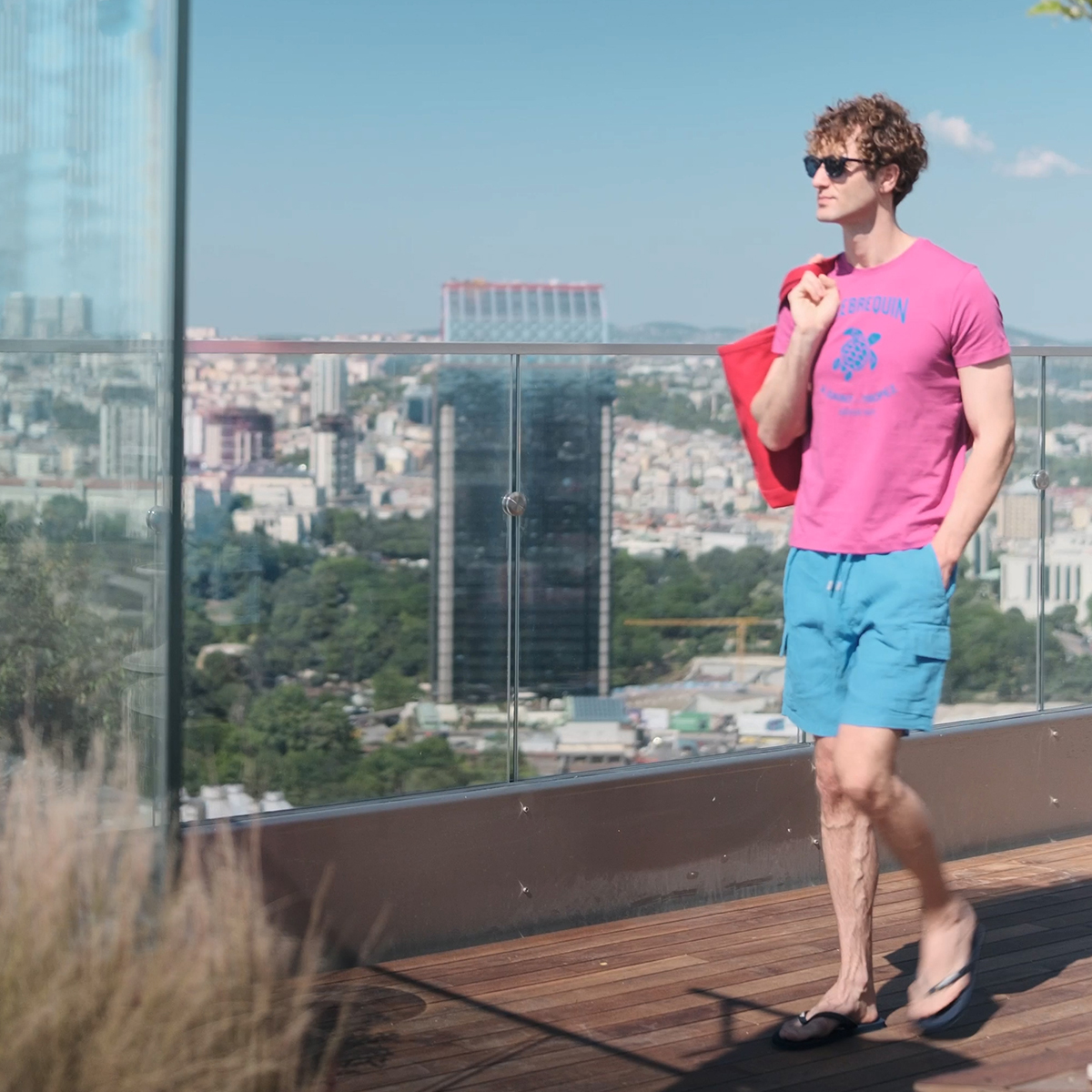 Önündeki ikonik Vilebrequin kaplumbağa logo ile dikkat çeken ve İtalya'da üretilen bu bisiklet yakalı tişört pamuk yapısı ile konfor sağlıyor.