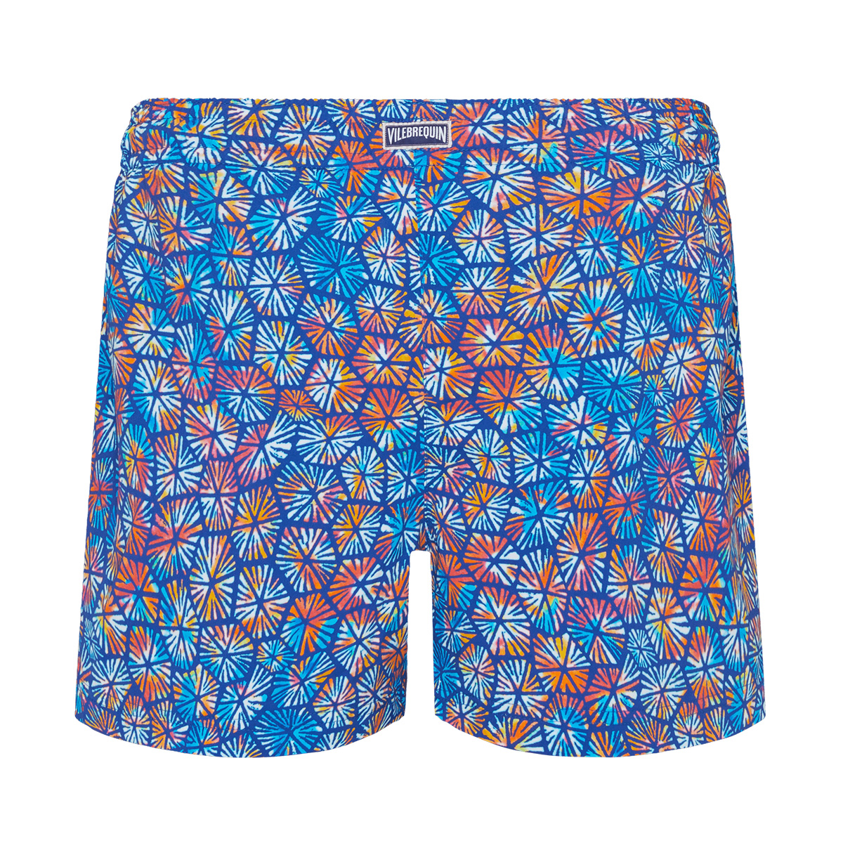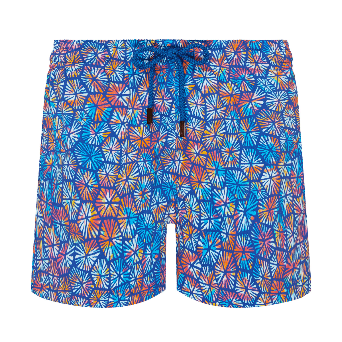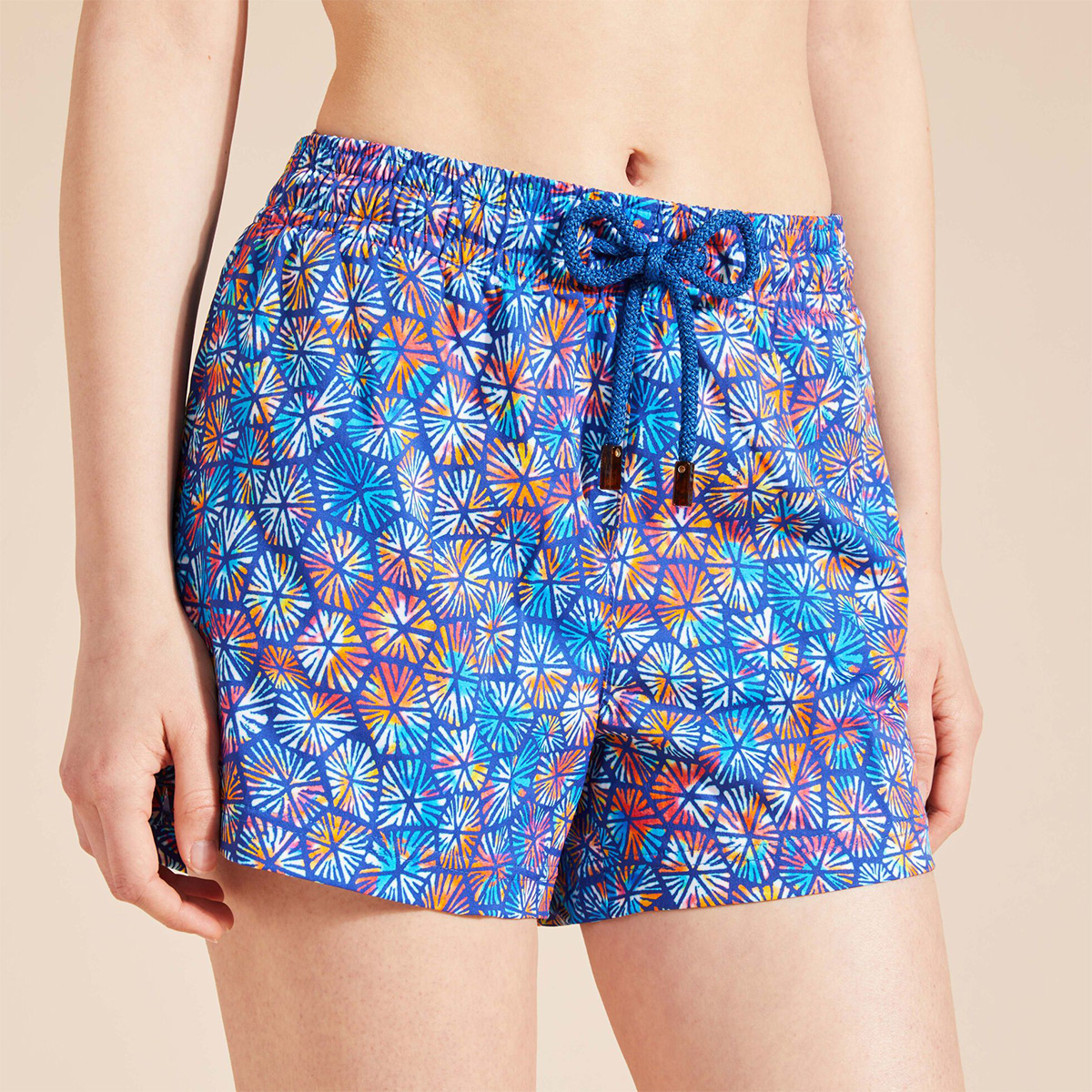 Zahmetsiz ve sade bir stil için geri dönüştürülmüş poliamid ve elastandan üretilmiş elastik kemerli, düz kesimli, yan yırtmaçlı, zarif kadın plaj şortu