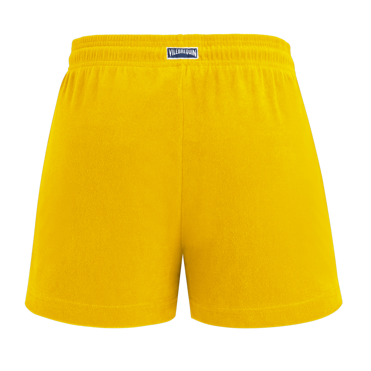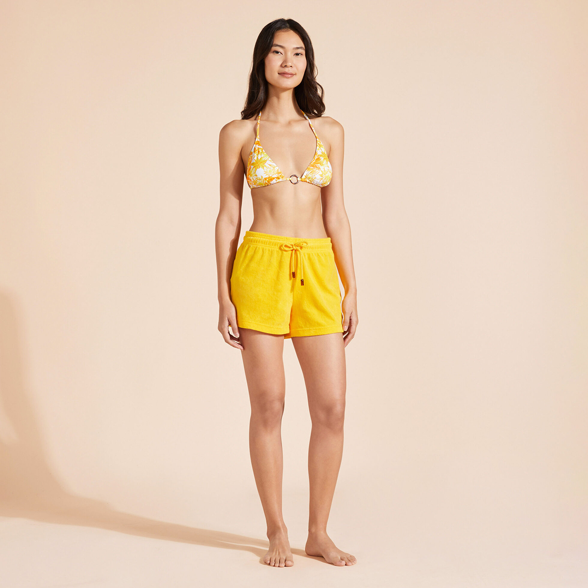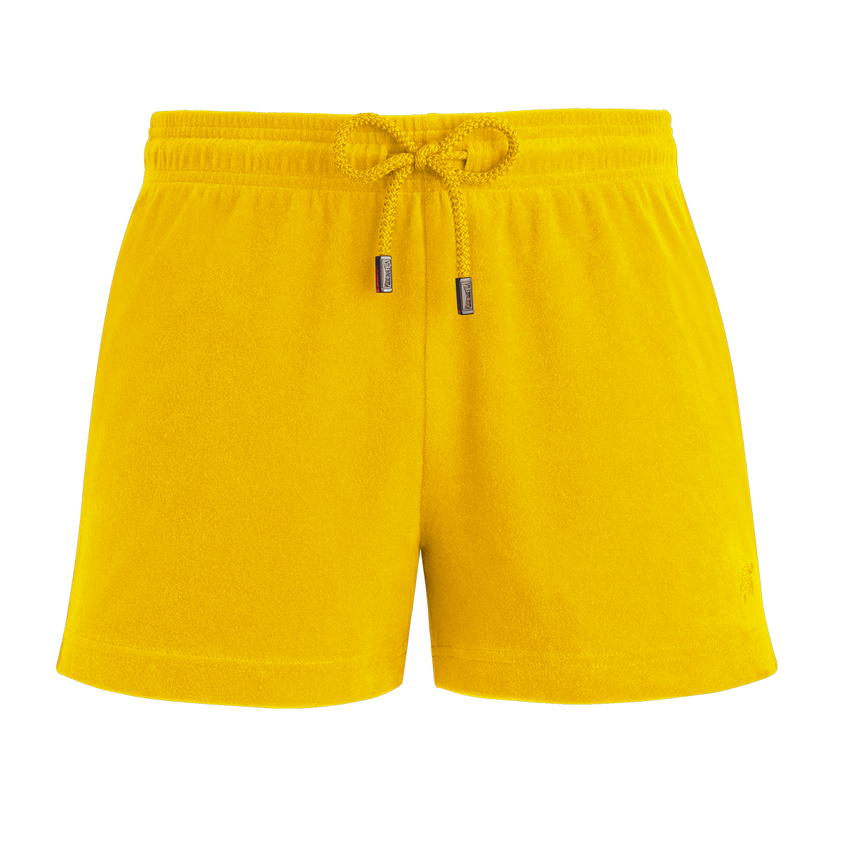 Bu düz renkli havlu şort, göz alıcı düz kesimi ve hareket kolaylığı sağlayan yan yırtmaçlı stili ile konfor ve şıklığı bir araya getirirken aynı zamanda serinlik sağlıyor.