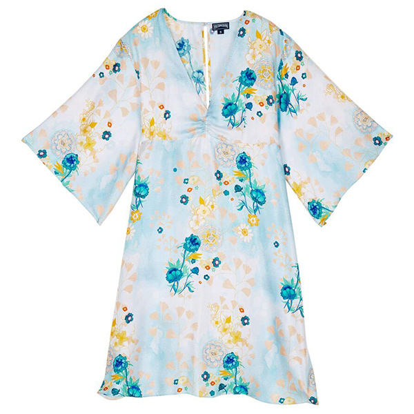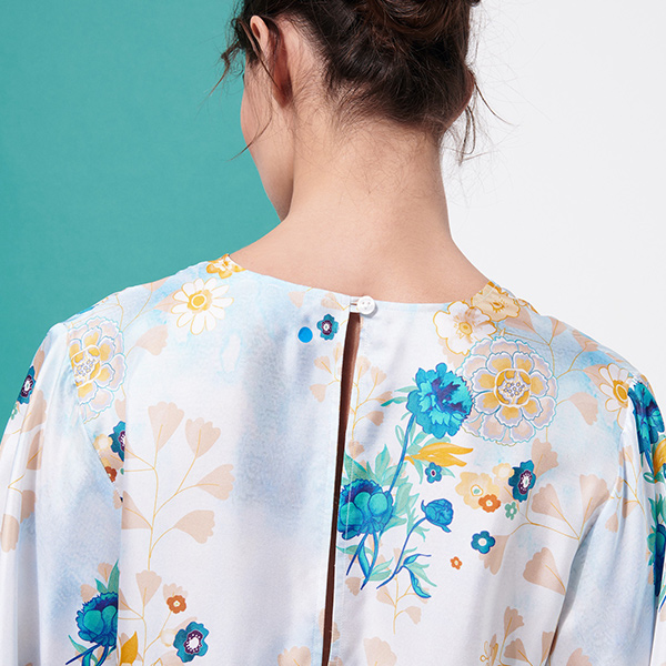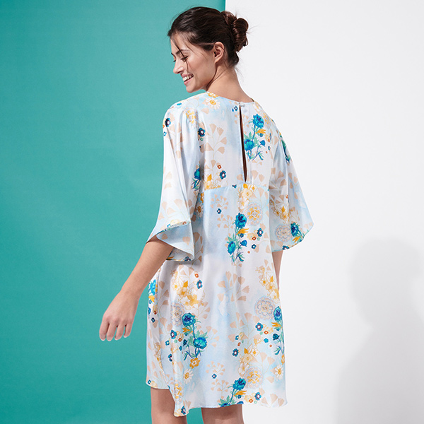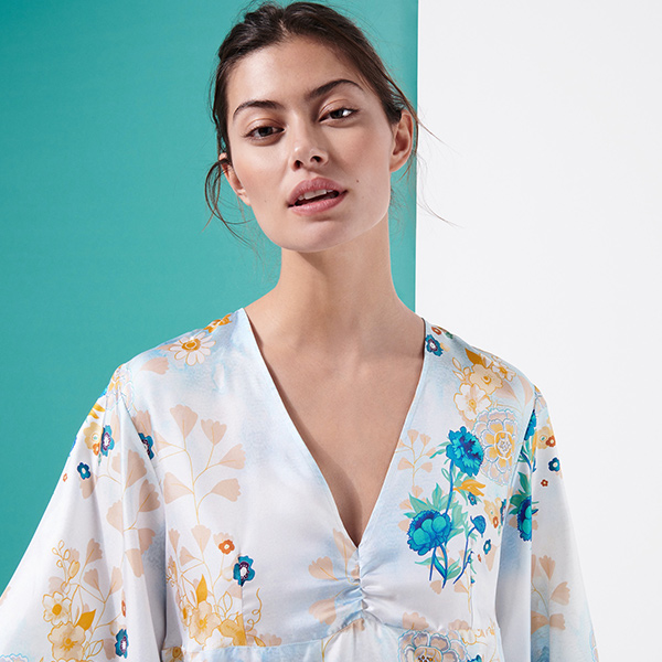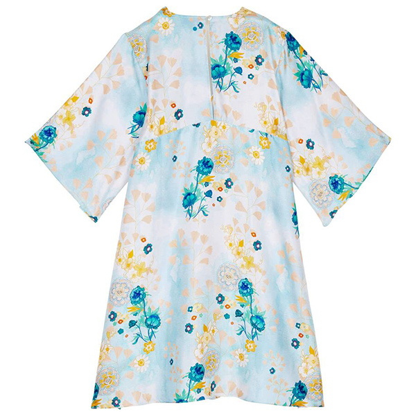 Floralia kadın ipek elbisesi, romantizm ve şiir dolu bir sezon için country tarzı buketlerle kaplı. Önde dalgalı bir V yaka ve arkada yırtmaç bulunur.