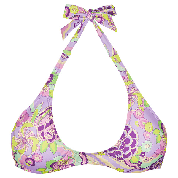 Bu Like Rainbow Flowers yuvarlak yakalı kadın bikini üstü üzerindeki harika desenlerle dikkat çekiyor. Bu minimalist bkini üstü boyunda ve arkada bağlanır ve tasarımı sayesinde boyun çizgisini uzatır.