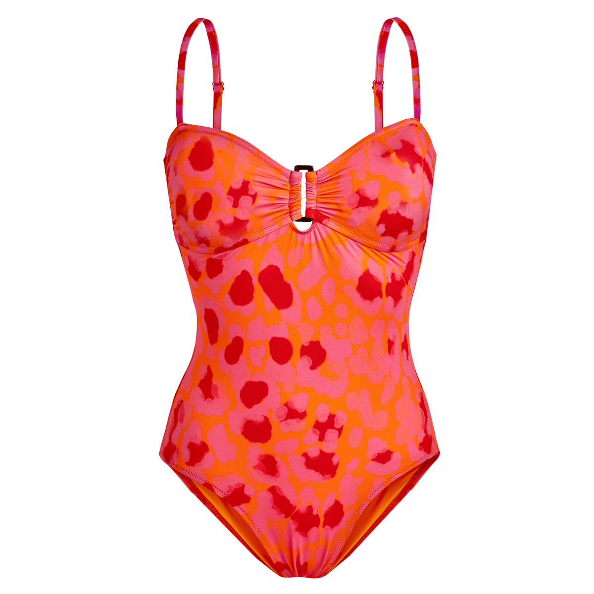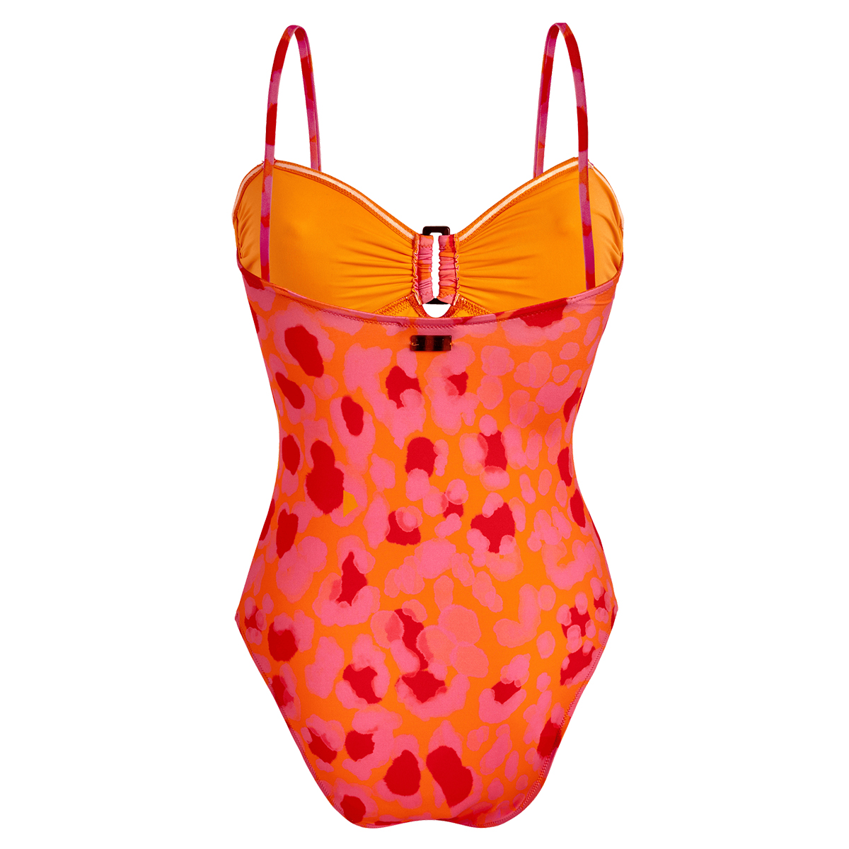 Bu ayarlanabilir ve çıkarılabilir askılı push-up tek parça mayo, hoş bir kesim ve canlı baskıyla şık bir görünüme kavuşuyor.