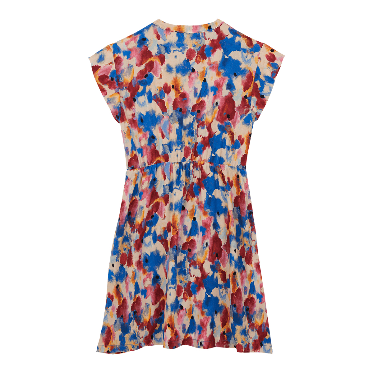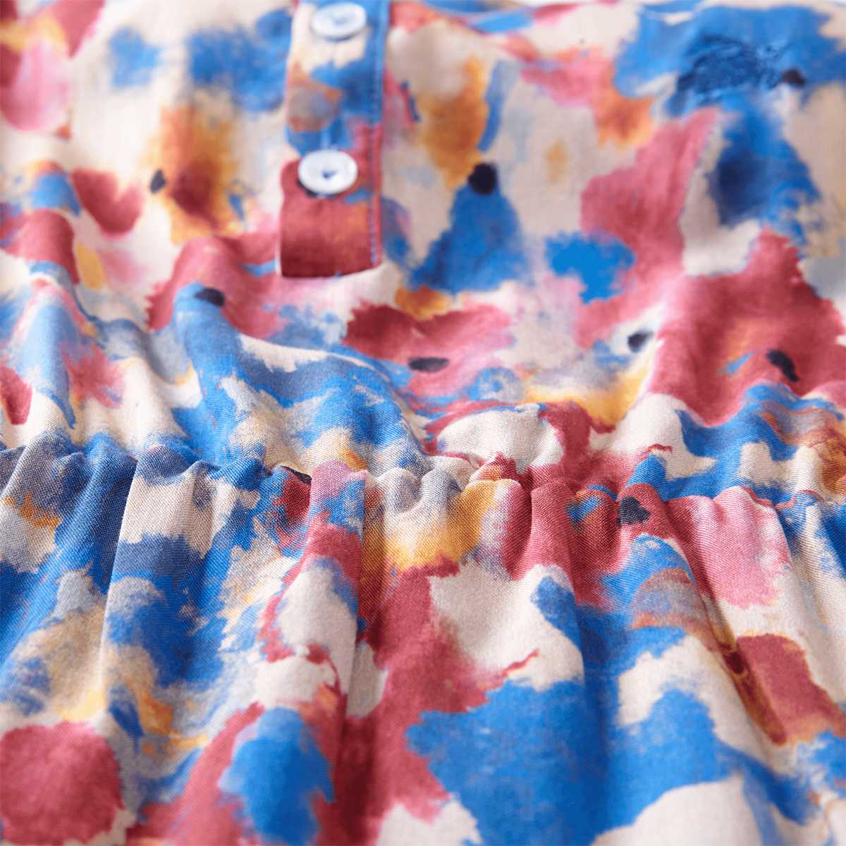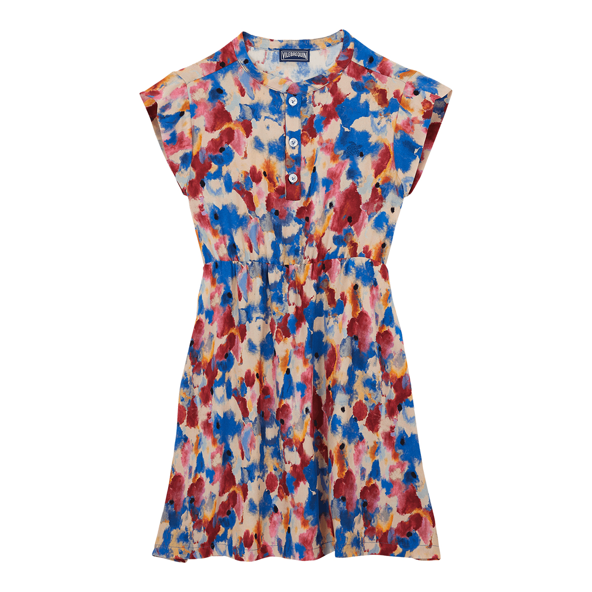 Şık yakalı, düğme detaylı, sofistike baskıya sahip muhteşem dökümlü kız elbisesi. Elastik bel kısmı plajda veya havuz kenarında oynarken rahatlık sunar.