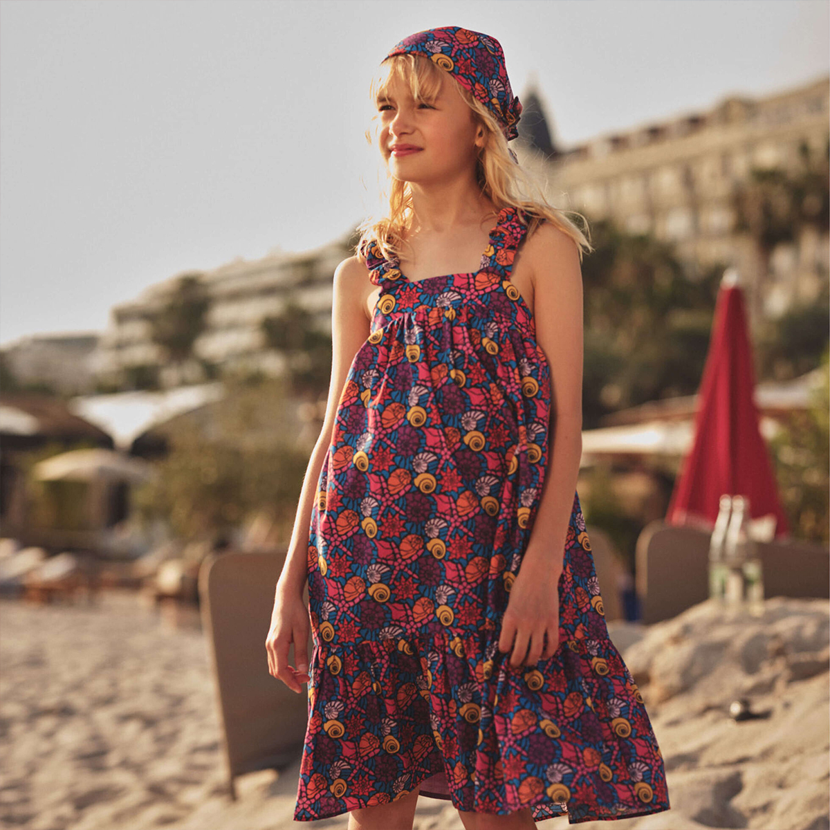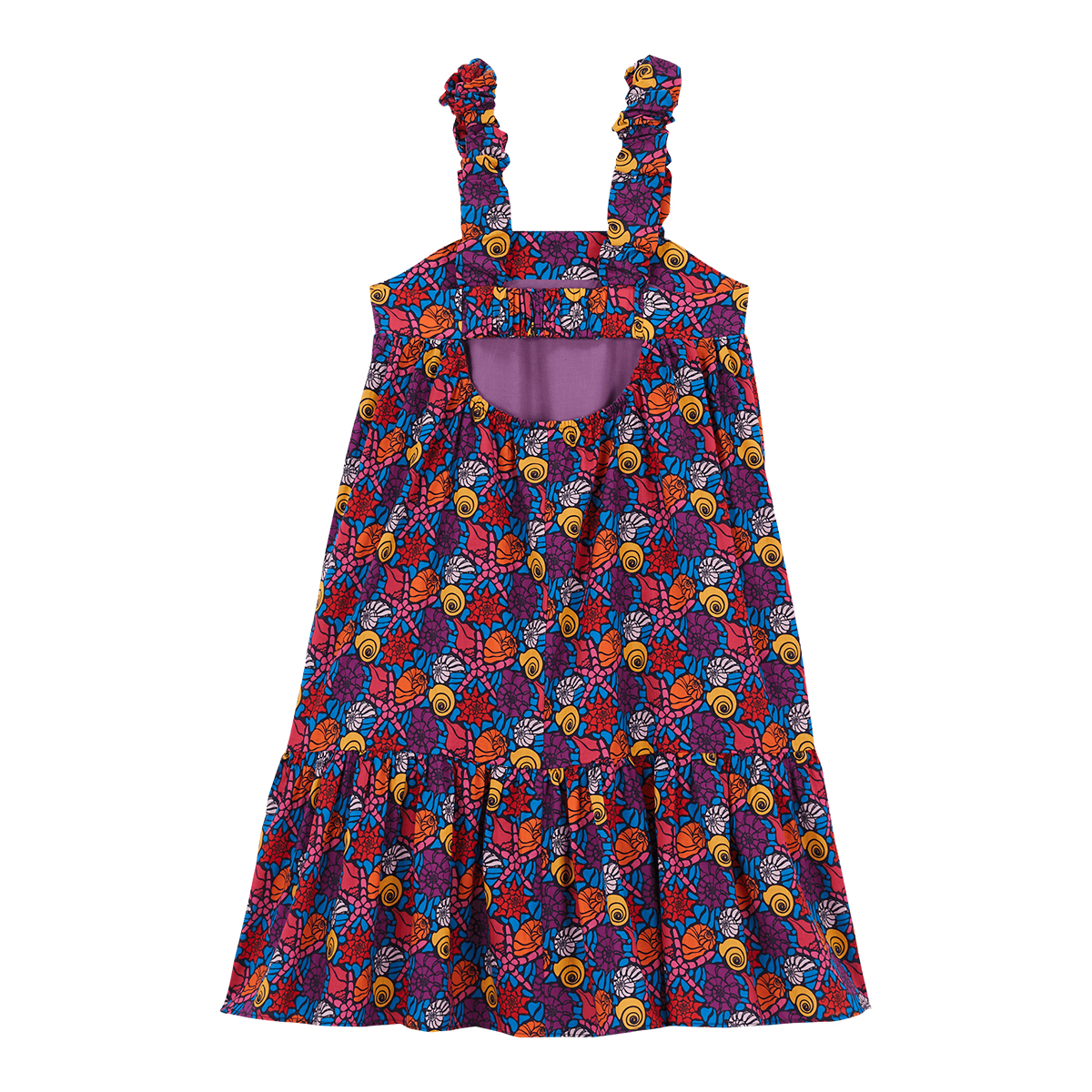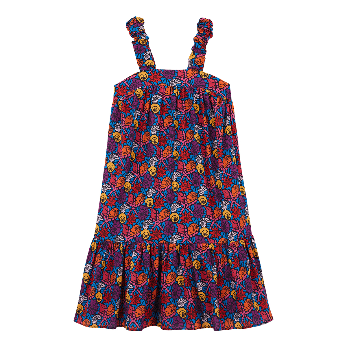 Deniz kenarında bir öğle yemeği için mükemmel, deniz kabuğu desenli sevimli kız elbisesi. Pamuktan üretilmiştir ve rahat bir uyum için elastik askılara sahiptir.