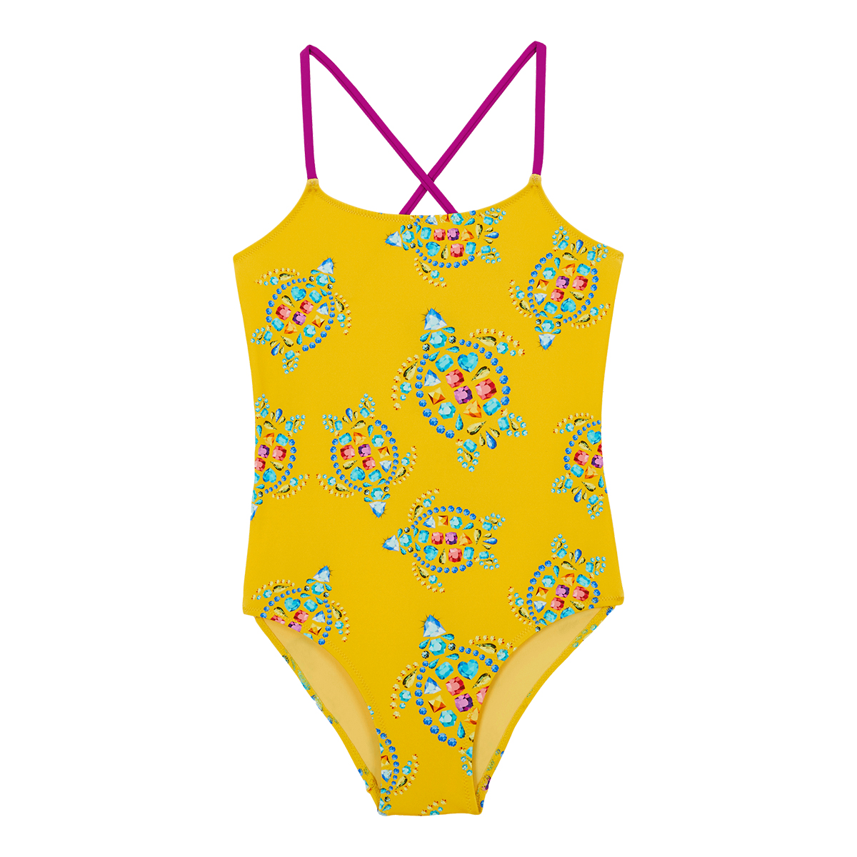 Yazı bu baskılı kız çocuk mayosuyla kucaklayın. Çapraz omuz askılarına sahip bu şık parça, geri dönüştürülmüş poliamid ve elastandan üretilmiştir.